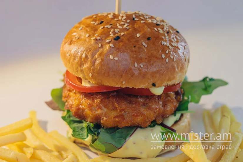 Ніжна бріошна булочка, соковита куряча котлетка, мікс салату, помідора, медово-гірчичний соус. Подається з картоплею фрі.