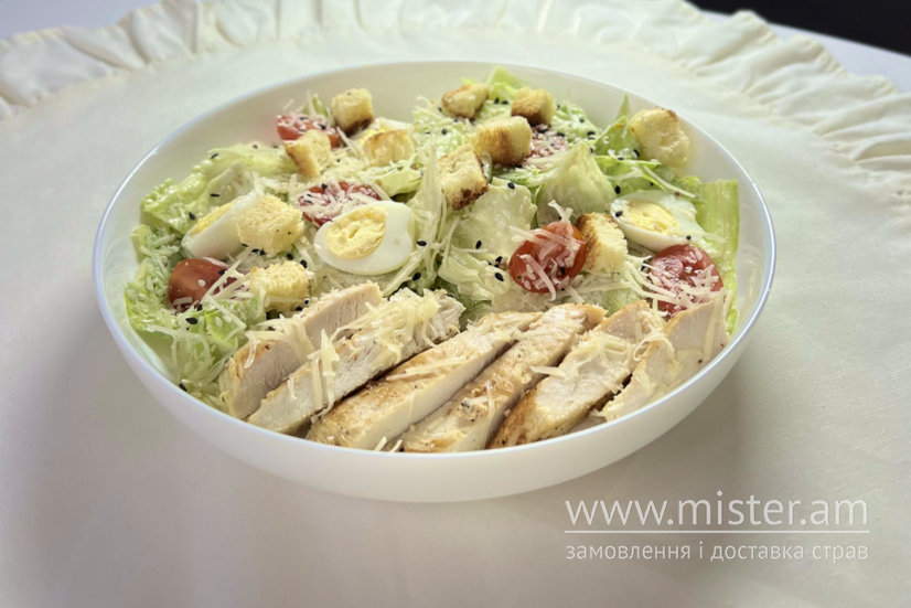 Каперси і анчоуси у класичному соусі Цезар, курочка та айсберг, томати чері, грісіні та перепелині яйця.