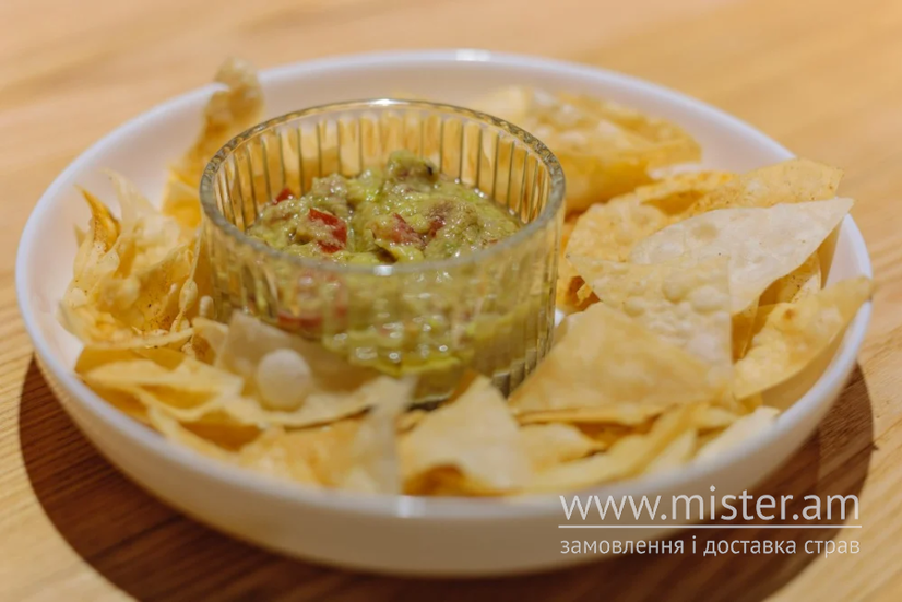 Хрумкі чіпси з мексиканським соусом гуакамоле, який ми готуємо з кремового авокадо, червоної цибульки, томатів, оливковоі олії та лимонного соку.