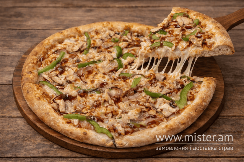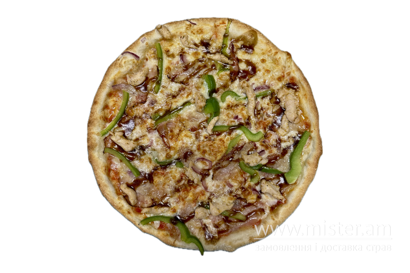 Томатний соус, моцарела, курка, бекон, перець болгарський, соус BBQ.