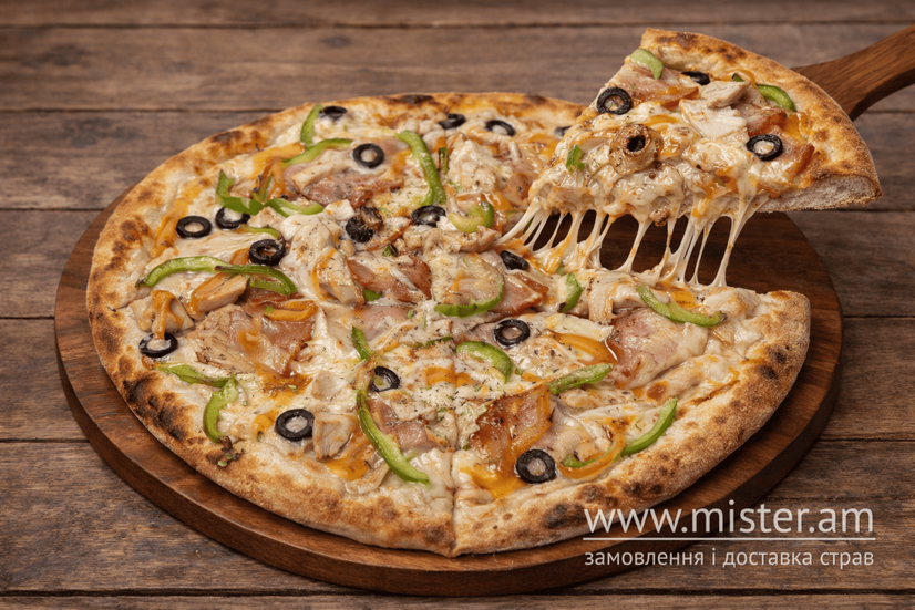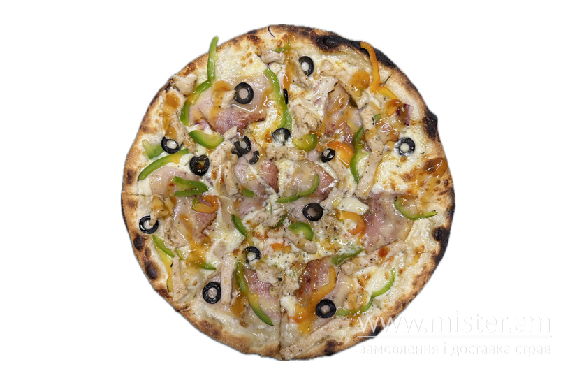 Вершковий соус, моцарела, бекон, цибуля, куряче філе, болгарський перець, маслини, соус Sweet Chilli, орегано