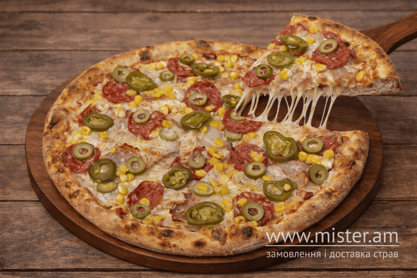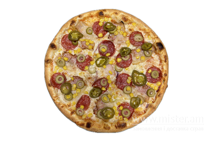 Томатний соус, моцарела, бекон, салямі, оливки, цибуля, кукурудза, перець чилі.
