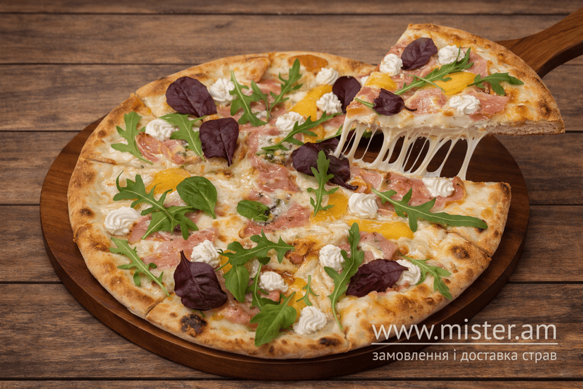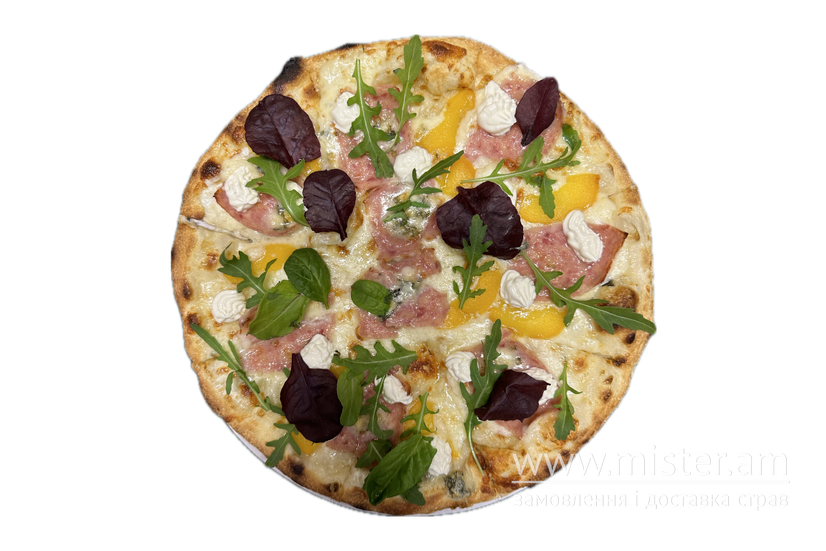 Вершковий соус, моцарела, шинка, персик, лазур (дорблю), крем-сир, мікс салата
