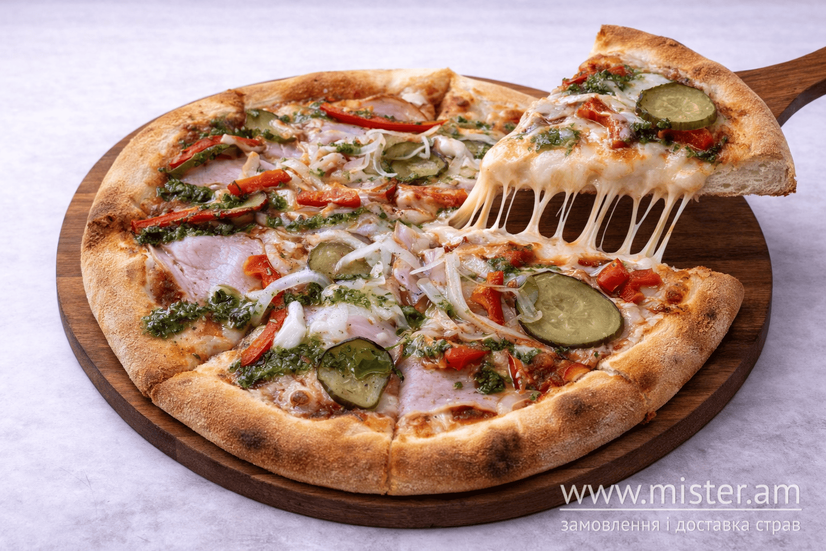 Піца: Піца Салямі, Піца М'ясна на вершковому соусі, Піца 6 сирів, Піца 4 сири, Піца з куркою, Піца М'ясна, Піца Маргарита, Піца Прошуто, Піца Цезаріно, ПІца з лососем, Піца Папероні, Піца Філадельфія, Піца "Кальцоне", Піца "Фрі з барбекю ", Піца "Фрі", Піца Техас, Піца Гаваї