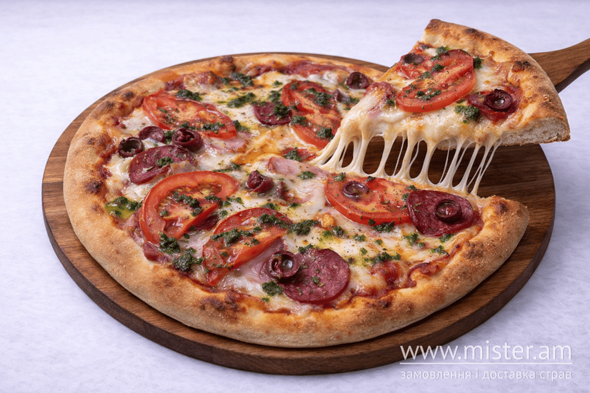 Піца: Піца Салямі, Піца М'ясна на вершковому соусі, Піца 6 сирів, Піца 4 сири, Піца з куркою, Піца Маргарита, Піца Прошуто, Піца Цезаріно, ПІца з лососем, Піца Папероні, Піца Філадельфія, Піца "Кальцоне", Піца "Фрі з барбекю ", Піца "Фрі", Піца Балик, Піца Техас, Піца Гаваї