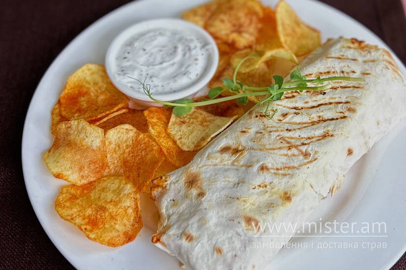 Лаваш, соус тартар, соус барбекю, сир чеддер, рване м’ясо, цибуля, огірок, помідор, айсберг, картопляні чіпси, соус сметанковий.