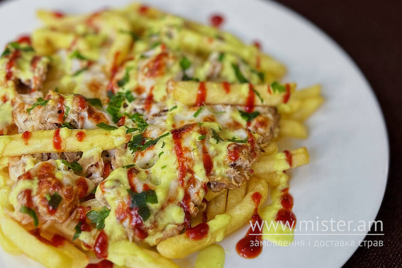 Фрі, м’ясо, сирний соус, BBQ, халапеньо, чеддер.