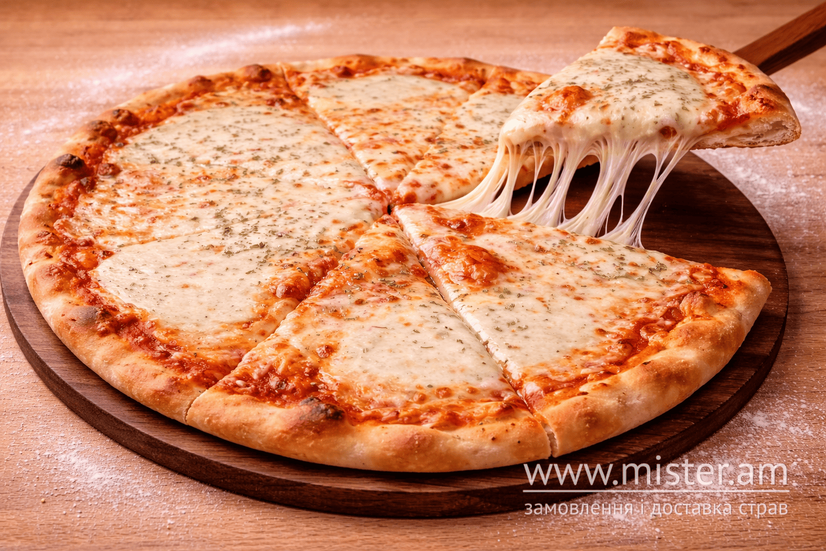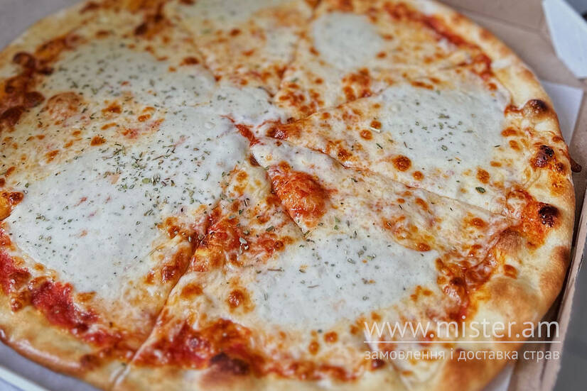 Соус з помідорів, моцарела, горгонзола, пармезан, фета.