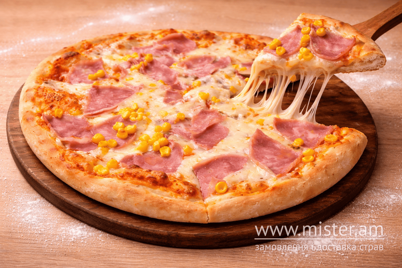Соус з помідорів, шинка, кукурудза, моцарела.