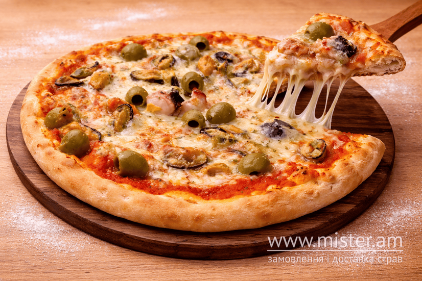 Соус з помідорів, оливки, морепродукти, моцарела.