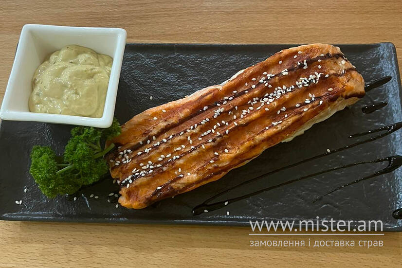 Філе хека, морква, броколі, печериці, кабачок, цибуля, цвітна капуста, помідор, майонез.