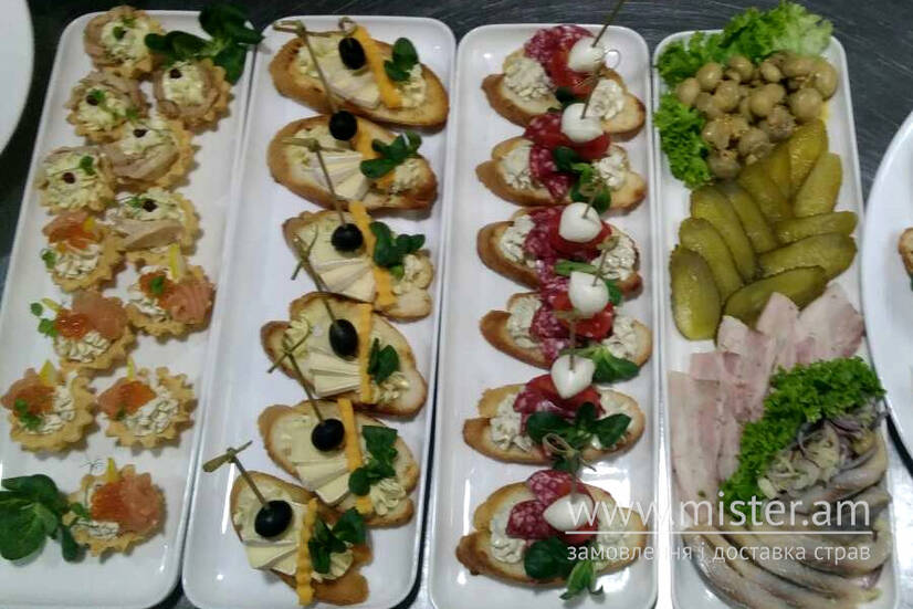 Закуски: Рибне асорті, Печериці в гірчичному соусі, Корзинка з червоною ікрою, Закуска по-українськи, М'ясне асорті по-домашньому, Сирне асорті, Овочева нарізка, Огірки квашені, Філе оселедця з картоплею, Маслини, Сало з часником, Брускетта з язиком, Брускетти з салом, Тост з червоною ікрою, Грінки з шпротами, Лаваш, Лисичка з серцем, Лисичка з сирком, Мозок смажений, Хліб