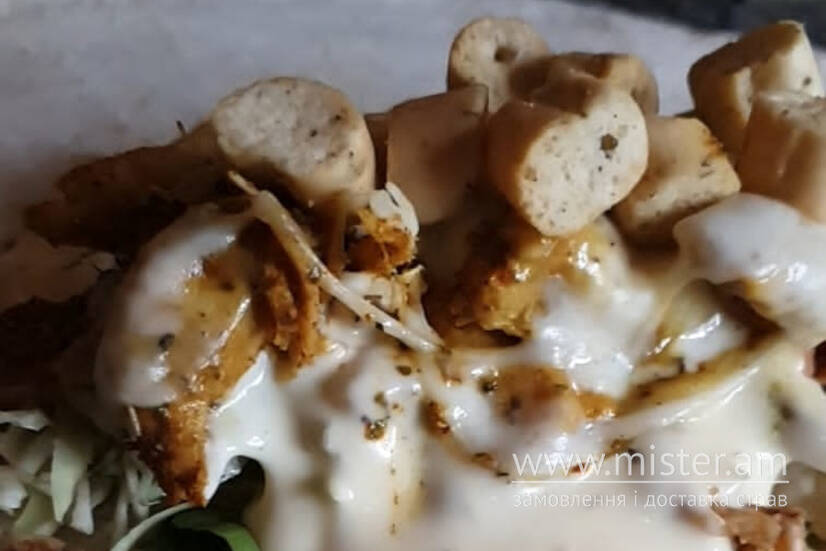 Капуста, курка смажена, цибуля, квашений огірок, брускети, сулугуні, соус.