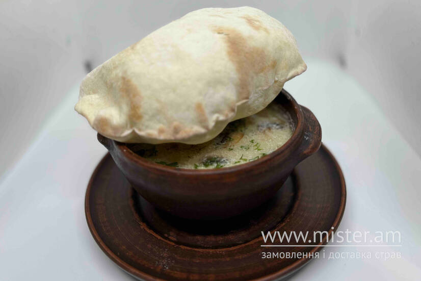 Пельмені, язик, печериці, цибуля, вершки.