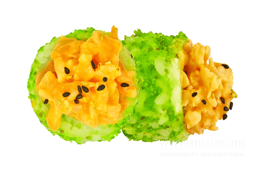 Рис, норі, крем-сир, ікра тобіко, креветка в темпурі, тартар, кунжут.