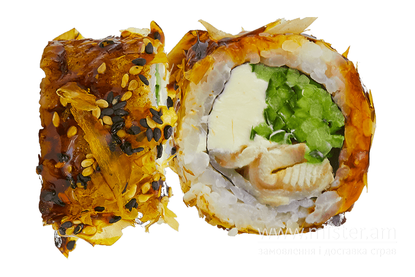 Рис, норі, стружка тунця, огірок, крем сир, вугор, соус унагі, кунжут.