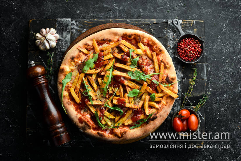 Соус томатний, моцарела, бекон, фрі, яйце, пармезан.