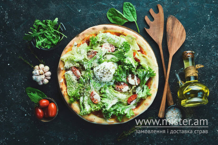 Моцарела, соус томатний, пармезан, бекон, мікс салат, яйце пашот, песто, соус цезар.