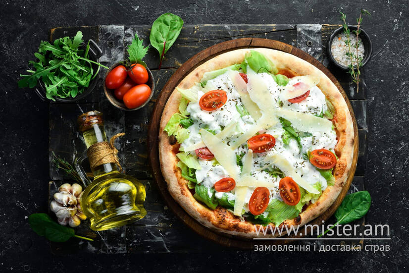 Моцарела, соус томатний, вершки, айсберг, черрі, пармезан, песто.