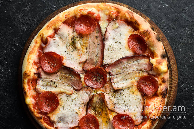 Моцарела, соус томатний, чорізо, шинка, салямі, сальсічіо, бекон.