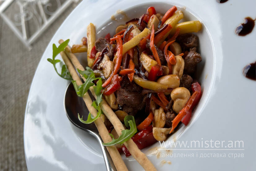 Телятина, печериці, цукіні, болгарський перець, морква.