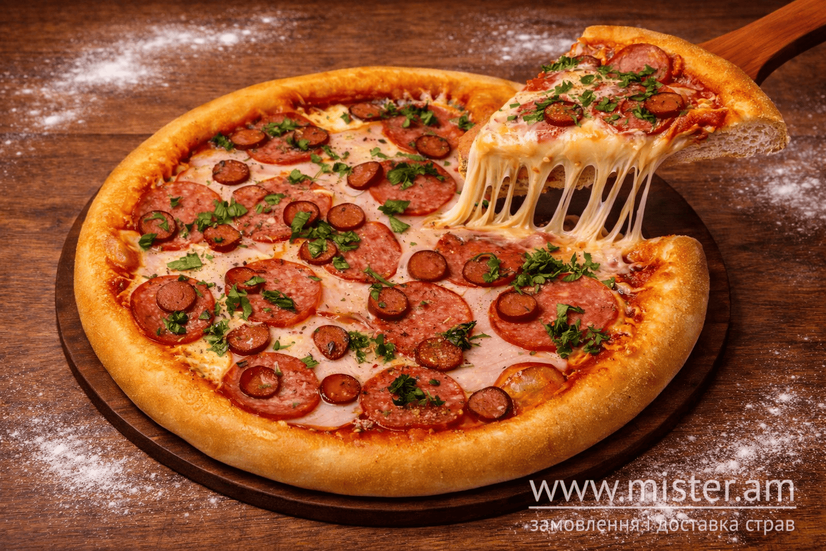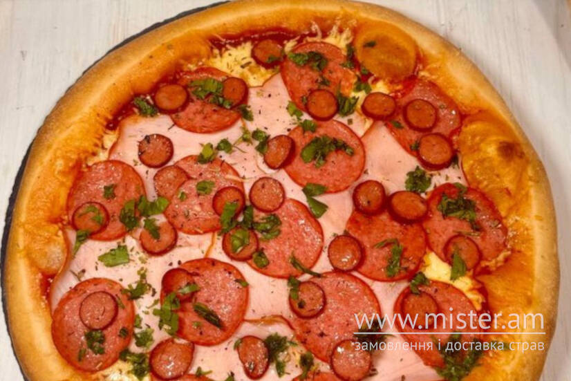 Соус томатний, сир, грудинка копчена, салямі, шинка, ковбаса напівкопчена.