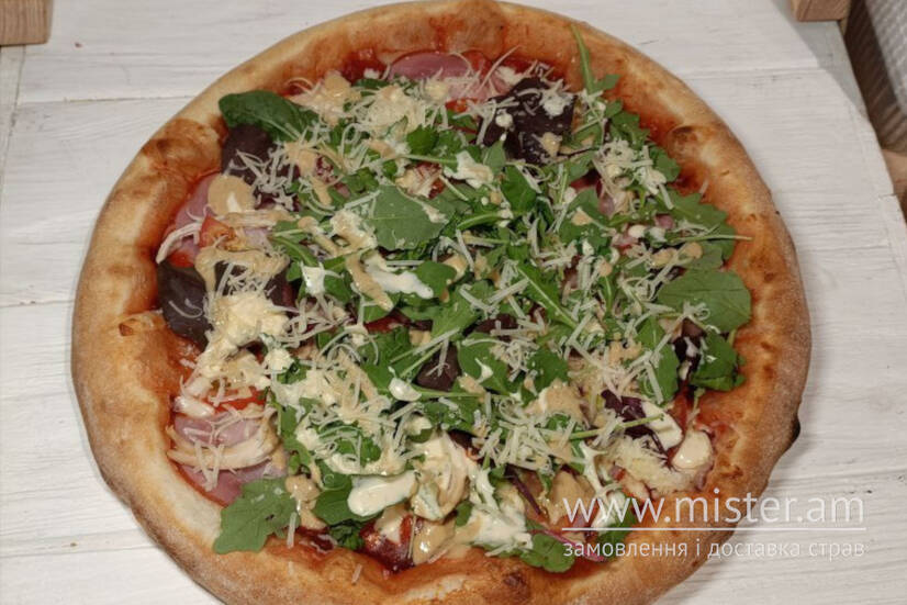 Вершки, сир моцарелла, куряче філе, помідори свіжі, грудинка копчена, листя салату, сир пармезан, базилік, соус.