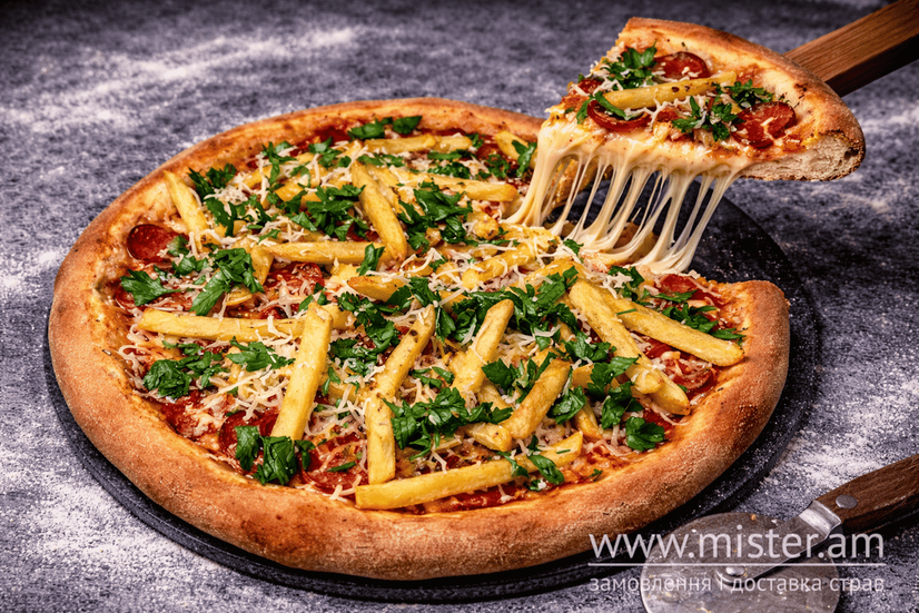 Кетчуп, картопля фрі, сир моцарелла, помідори свіжі, мисливські ковбаски, зелень, сир пармезан.