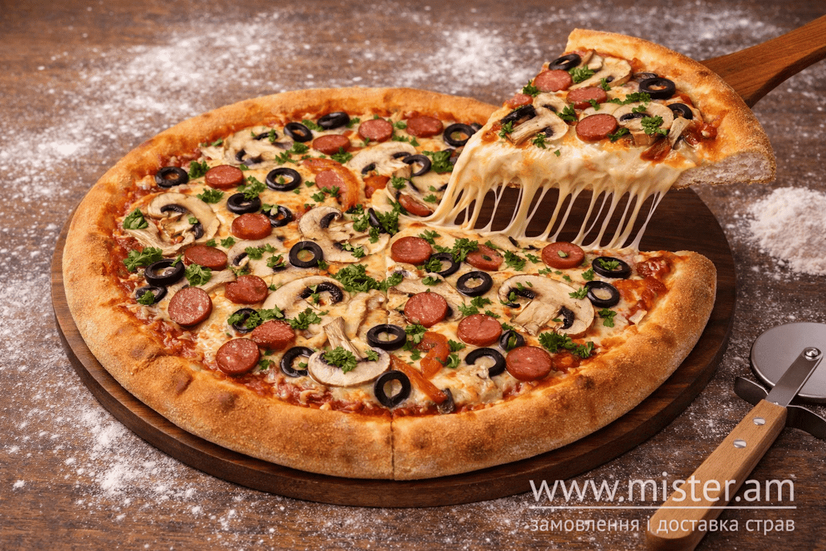 Соус томатний, печериці, мисливські ковбаски, оливки, сир, зелень.
