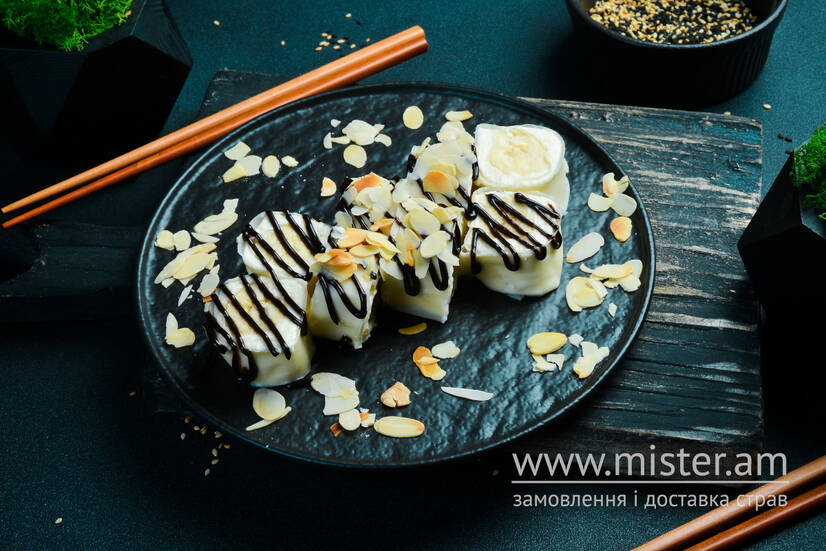 Рисовий папір, крем-сир, кокосовий сироп, кокосова стружка, банан, топінг Шоколад, мигдалеві пластівці