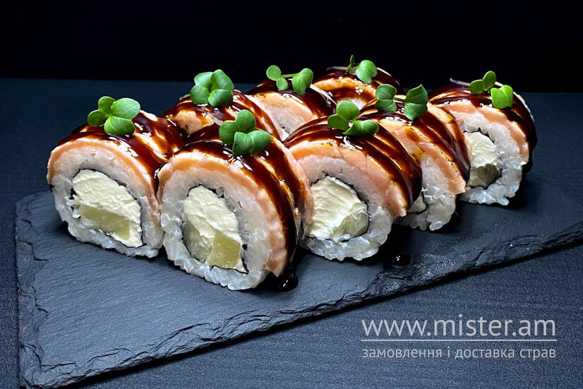 Норі, рис, крем-сир, ананас, лосось, соус Унагі