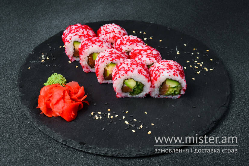 Норі, рис, огірок, авокадо, лосось, ікра Масаго