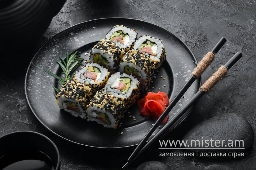 Норі, рис, крем-сир, огірок, авокадо, лосось, кунжут