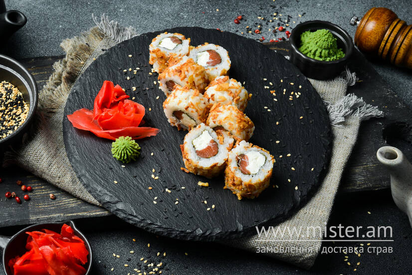 Норі, рис, крем-сир, сир Фета, лосось, цибулевий кранч