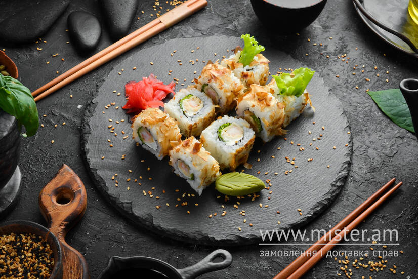 Норі, рис, крем-сир, салат Айсберг, креветка в темпурі, стружка тунця
