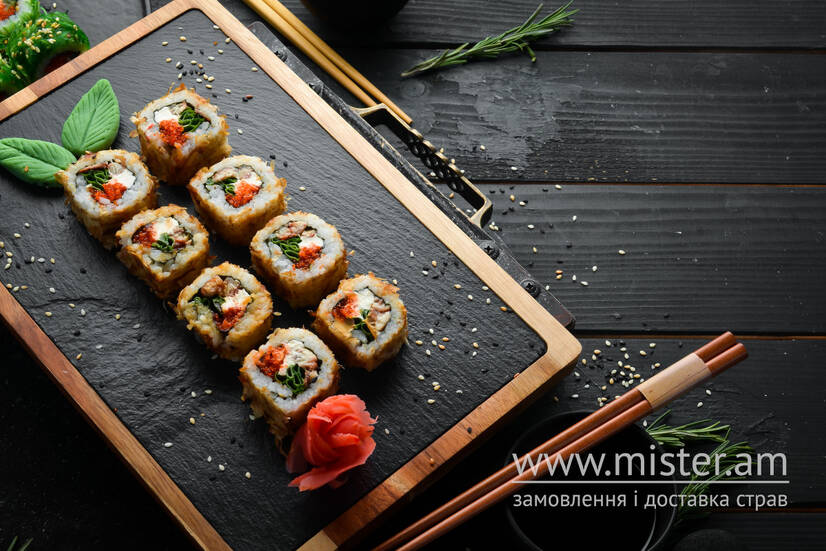 Норі, рис, крем-сир, ікра Масаго, вугор, зелена цибуля, стружка тунця