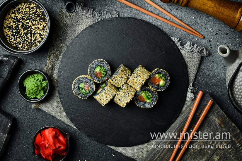 Норі, рис, чорнило каракатиці, огірок, авокадо, лосось, кунжут