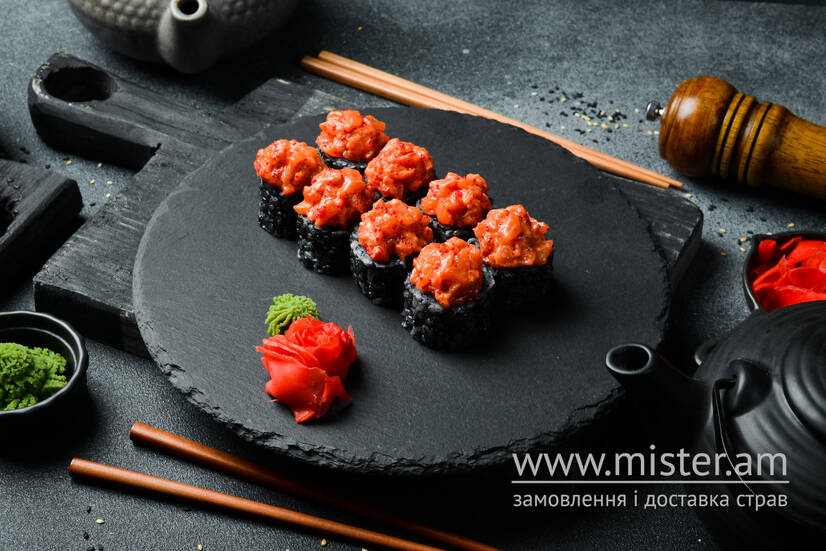 Норі, рис, чорнило каракатиці, крем-сир, лосось, тунець, майонез, ікра Масаго, соус Шрірача