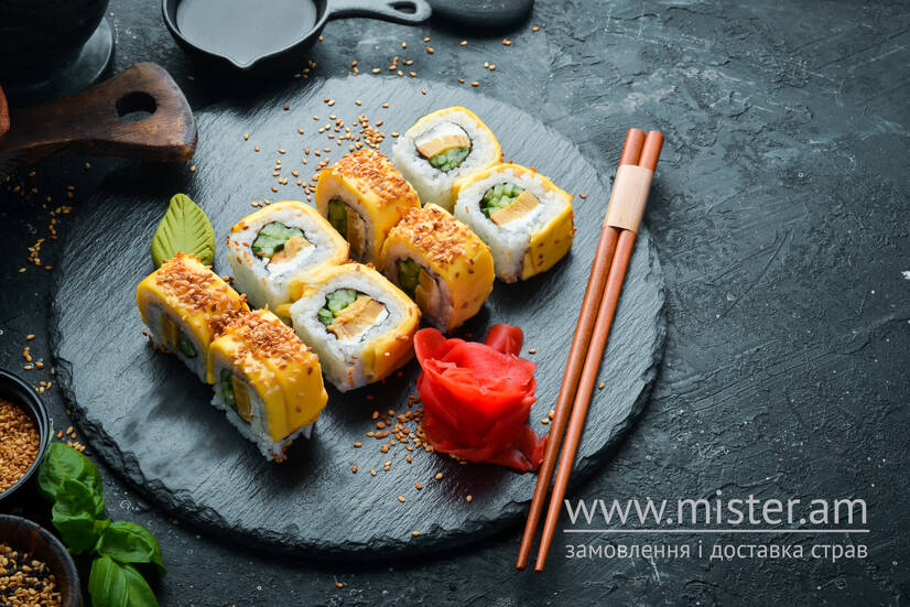 Норі, рис, крем-сир, тамаго, огірок, тостовий сир, кунжут