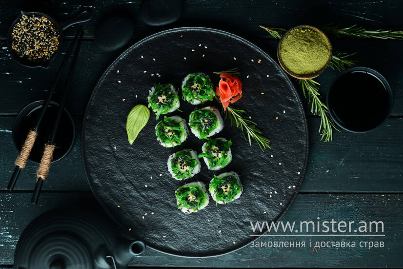 Норі, рис, крем-сир, помідор, креветка, салат Чука, соус Горіховий, кунжут