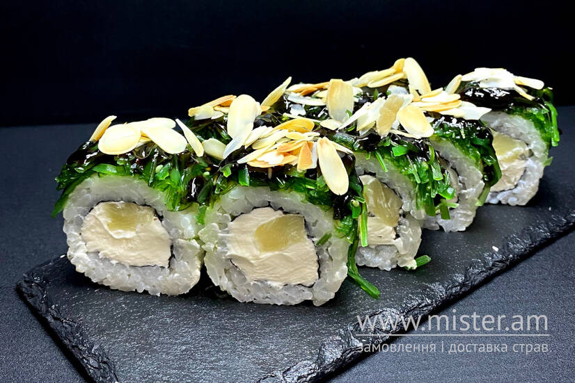 Норі, рис, крем-сир, ананас, салат Чука, соус Унагі, мигдалеві пластівці