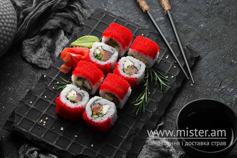 Норі, рис, крем-сир, огірок, лосось, ікра Масаго