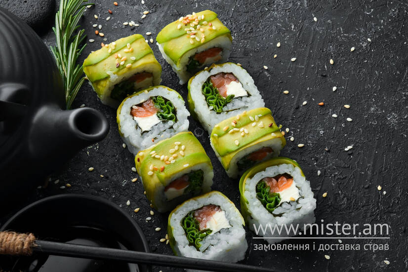 Норі, рис, крем-сир, зелена цибуля, лосось, авокадо, кунжут
