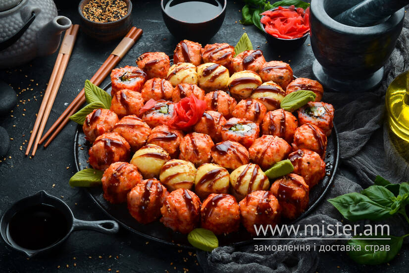 Роли: Запечений з лососем, Запечений з вугрем, Запечений з крабом, Запечений з креветкою, Запечений сирний