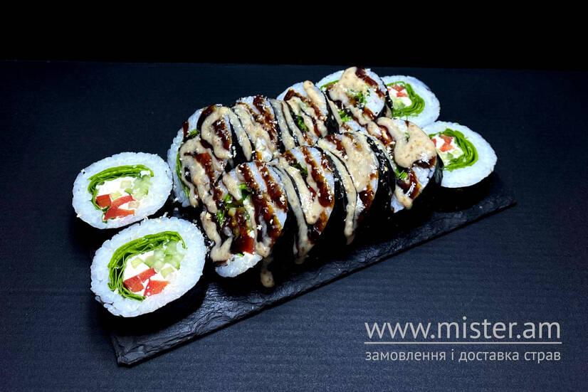 Норі, рис, шпинат, огірок, перець, сир Тофу, соус Унагі, соус Горіховий, кеш'ю