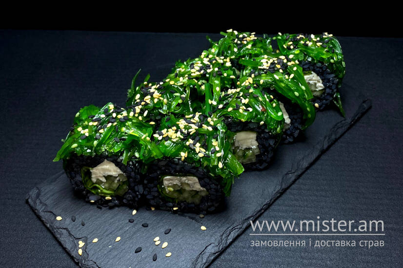Норі, рис, чорнило каракатиці, сир Тофу, огірок, шпинат, салат Чука, кунжут ч/б.