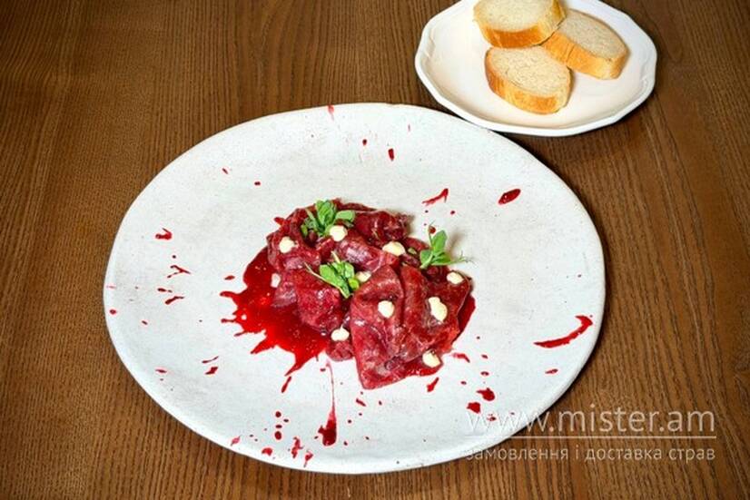 Яловича вирізка, малиново - бальзамічне кюлі, трюфельний майонез, оливкова олія, багет.