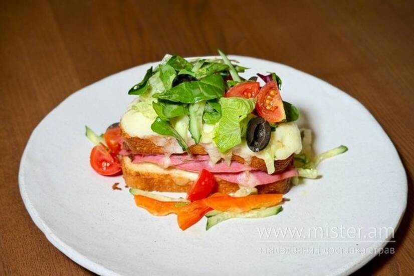 Бріош, яйце, мортаделла, соус Бешамель, огірок, перець болгарський, соус медово-гірчичний, чері, салат мікс, оливки Каламата, страчателла.