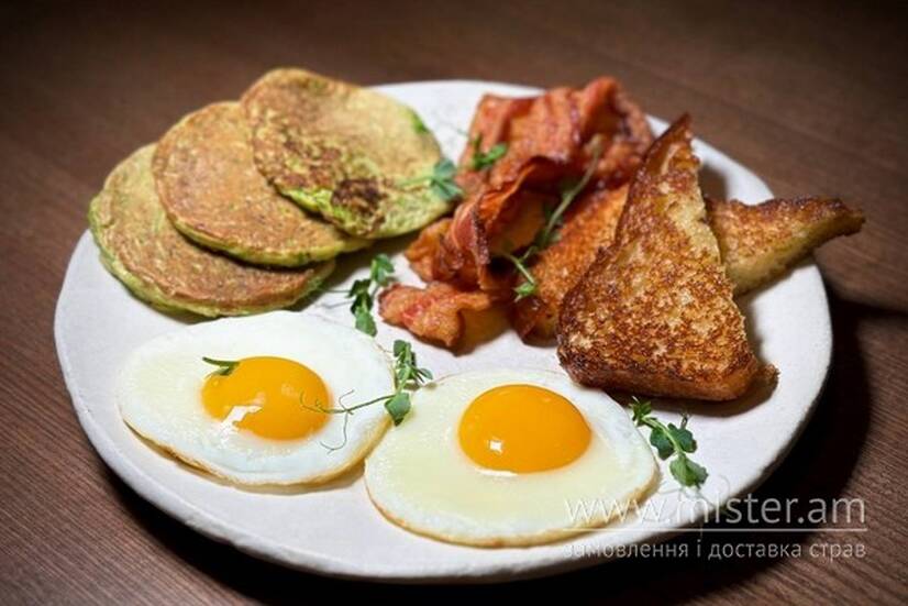Оладки з цукіні, бекон, бріош, яйця, мікрогрін.