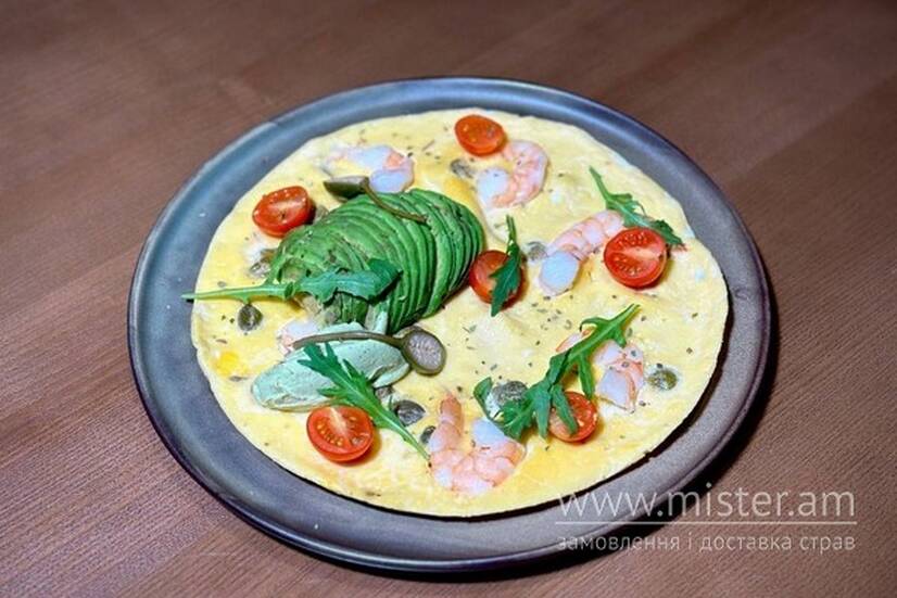 Вершковий омлет з креветками, авокадо, каперсами, чері та кремом з авокадо.